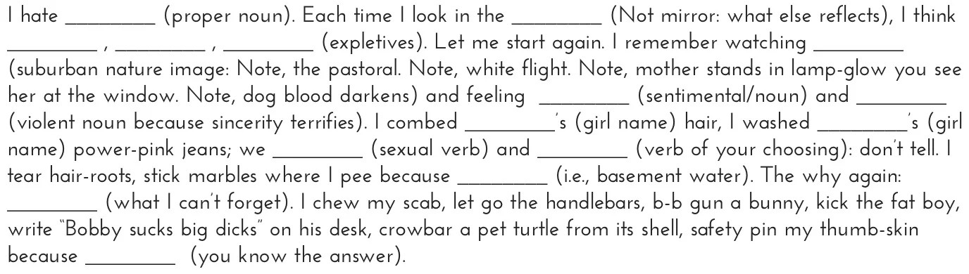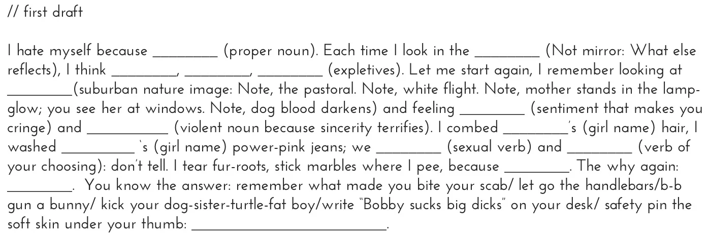 The blank spaces in “Lucy Mad Lib” allow the reader to insert their own horrors. The last three blanks beg us to explain why Lucy sticks marbles in her vagina and crowbars a turtle from its shell and safety pins her thumb-skin. If you are white and middle class in America, Lucy’s your daughter your pathology your hurt and angry creature; it’s your job, as well as mine, to fill in her horrors.